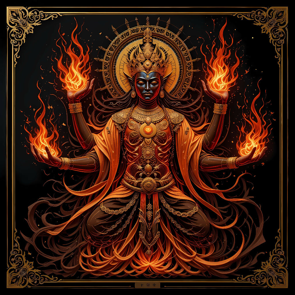 An elegant design art themes wayang kulit art, the scene dramatic beautiful god with 4 hands holding spiritual power the colors lite red flames fires with star dust lite bright liquid gold with black bold  framing by elegant border.