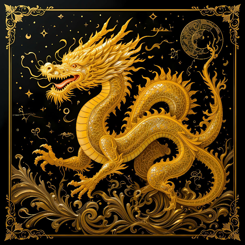 The elegant golden dragon themes in wayang kulit art style  of the dragon, the scene dramatic the colors lite yellow bright liquid gold , framing by elegant border