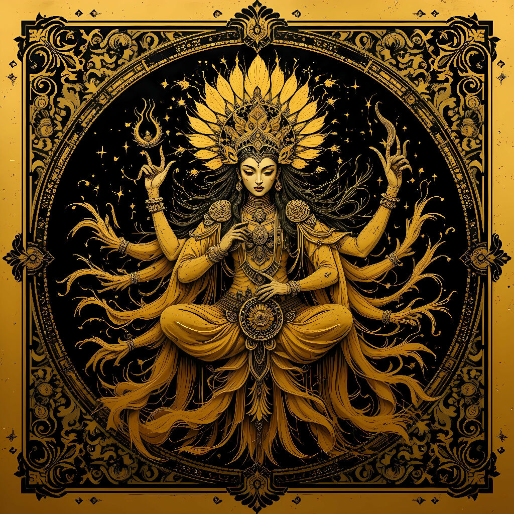 An elegant design art created with wayang kulit themes , the scene dramatic beautiful god, the colors lite yellow bright liquid gold with black bold  framing by elegant border.