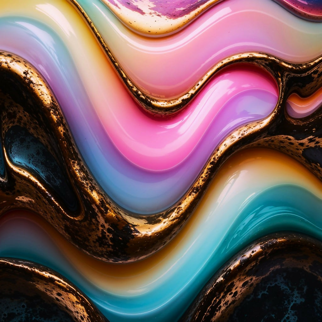 A mesmerizing fusion of pastel hues and gold metallic textures, featuring smooth, flowing waves that create movement and depth. The dynamic interplay of colors enhances the brilliance of the composition, making this artwork a refined choice for modern interiors and collectors.