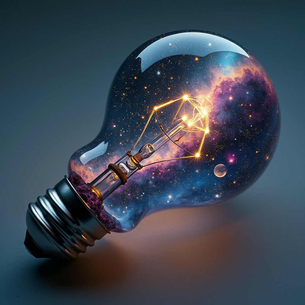 A surreal and captivating piece that envisions an entire galaxy contained within the fragile shell of a classic glass lightbulb. Inside, swirls of deep blues, purples, and black form a miniature cosmic scene, dotted with tiny stars, glowing nebulae, and shimmering streaks of light. The liquid-like motion of the "space" within gives the impression of a living, breathing universe, defying the constraints of the bulb. Set against a minimal background, this artwork merges science fiction and artistic elegance, offering a striking representation of infinite wonder confined within a simple, everyday object. Perfect for dreamers and lovers of the cosmos.