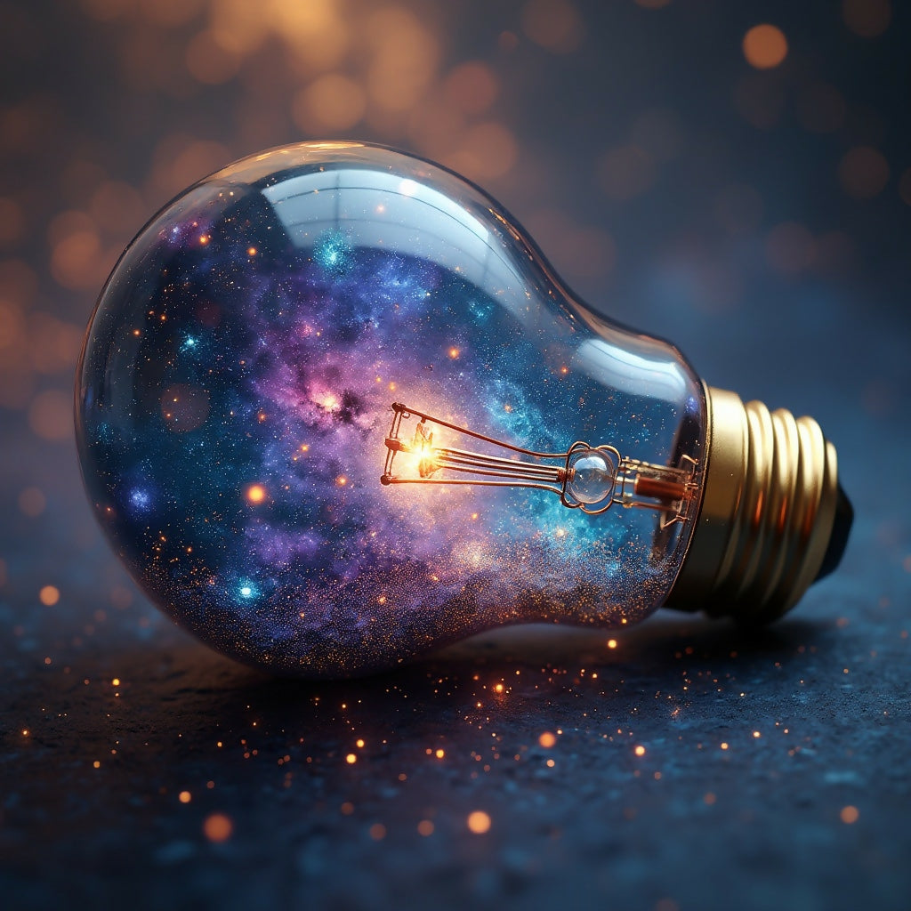 A surreal and captivating piece that envisions an entire galaxy contained within the fragile shell of a classic glass lightbulb. Inside, swirls of deep blues, purples, and black form a miniature cosmic scene, dotted with tiny stars, glowing nebulae, and shimmering streaks of light. The liquid-like motion of the "space" within gives the impression of a living, breathing universe, defying the constraints of the bulb. Set against a minimal background, this artwork merges science fiction and artistic elegance, offering a striking representation of infinite wonder confined within a simple, everyday object. Perfect for dreamers and lovers of the cosmos.