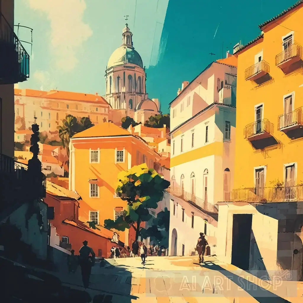 Lisbon, Portugal, Centro, old houses, large windows, yellow, brown, blue sky, church, shadows