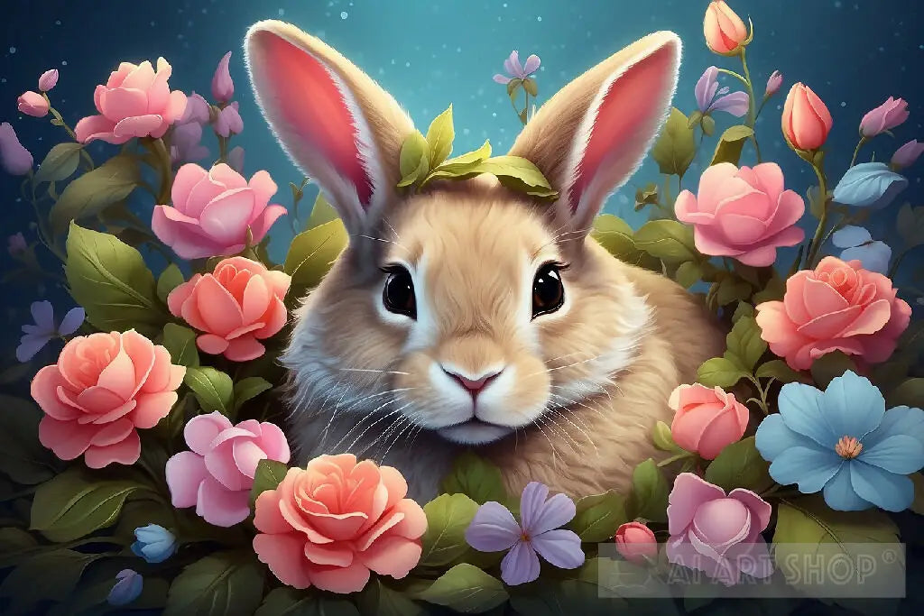 A digital painting showing a baby fawn nestled among a bed of vibrant green grass and colorful wildflowers. The fawn's fur is depicted with intricate detail, displaying shades of soft browns and creamy whites. Its eyes, wide and innocent, gaze curiously at the world around it. Rays of sunlight filter through the trees above, casting a warm, ethereal glow on the scene. The overall effect is one of tranquility and natural beauty, capturing the delicate essence of a newborn fawn in the wilderness.