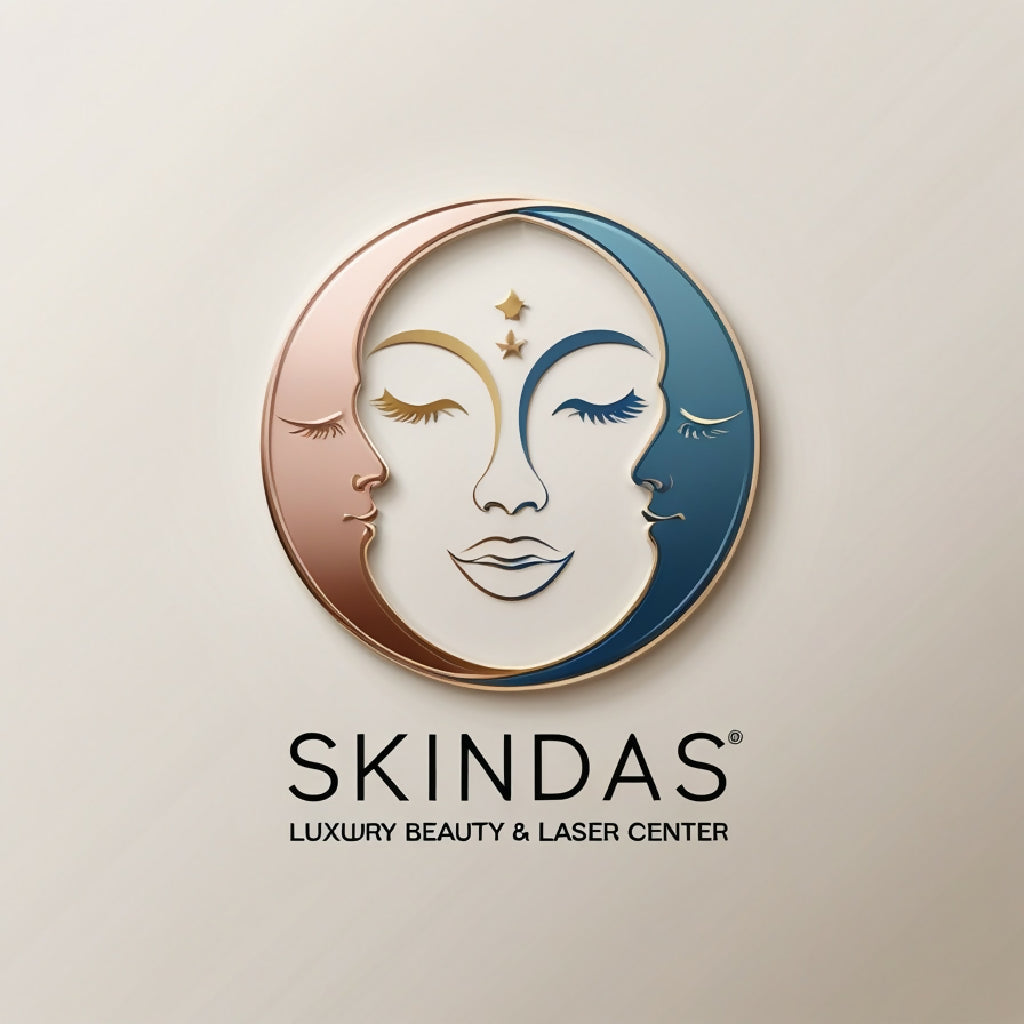 Logo design for a luxury beauty and laser center called "SKINDAS". Concept: combination of the sun and the moon in one circular shape, elegant minimalistic face line art in the center, representing balance between day and night skin care. Style: premium, clean, minimal, modern, aesthetic. Colors: rose gold + gold + soft beige + moonlight blue (no gradients), use a clear readable font, luxury typography. Background: simple solid color, no shadows, no textures. Logo must be vector style, high quality, sharp lines, refined, professional branding.