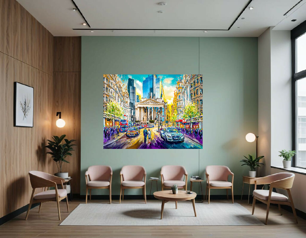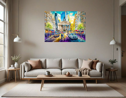 This is a vibrant and energetic cityscape painting, likely depicting a street in London. The artwork uses a bold impasto technique with thick, textured brushstrokes and a bright, almost fauvist color palette.