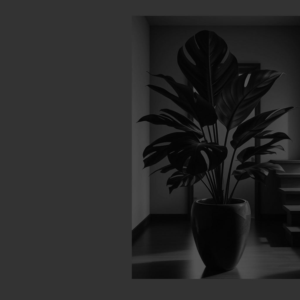 A lone houseplant sits quietly near the stairs in a dim, shadowed room. Its leaves, rendered in shades of black and white, catch faint streaks of light, creating sharp contrasts of texture. The surrounding darkness makes the plant appear both delicate and mysterious.