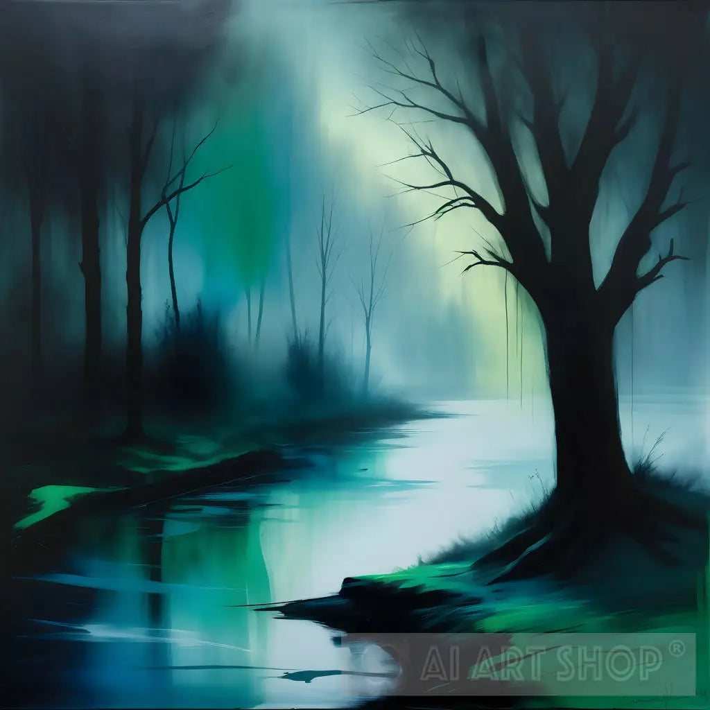 This AI painting is not what it originally looked like. I improved it tremendously in Adobe Photoshop. There was a man sitting on a bench, he didn't quite fit the setting so I removed that from the painting. There was also something wrong with the water, I did a lot of work on that too. In the end, this AI painting became my ''Lonely River''.
