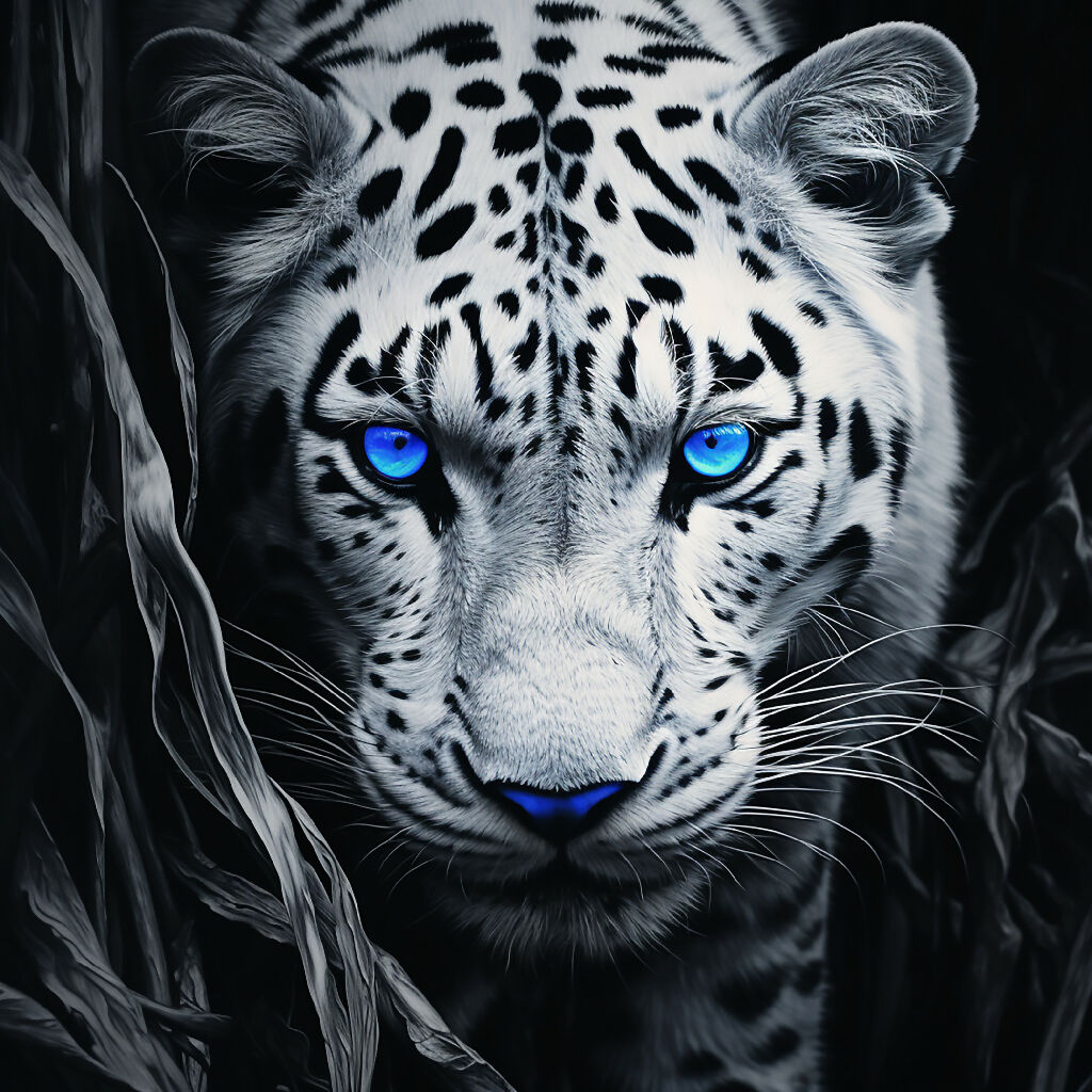 A black and white photo of a leopard with mesmerizing blue eyes.