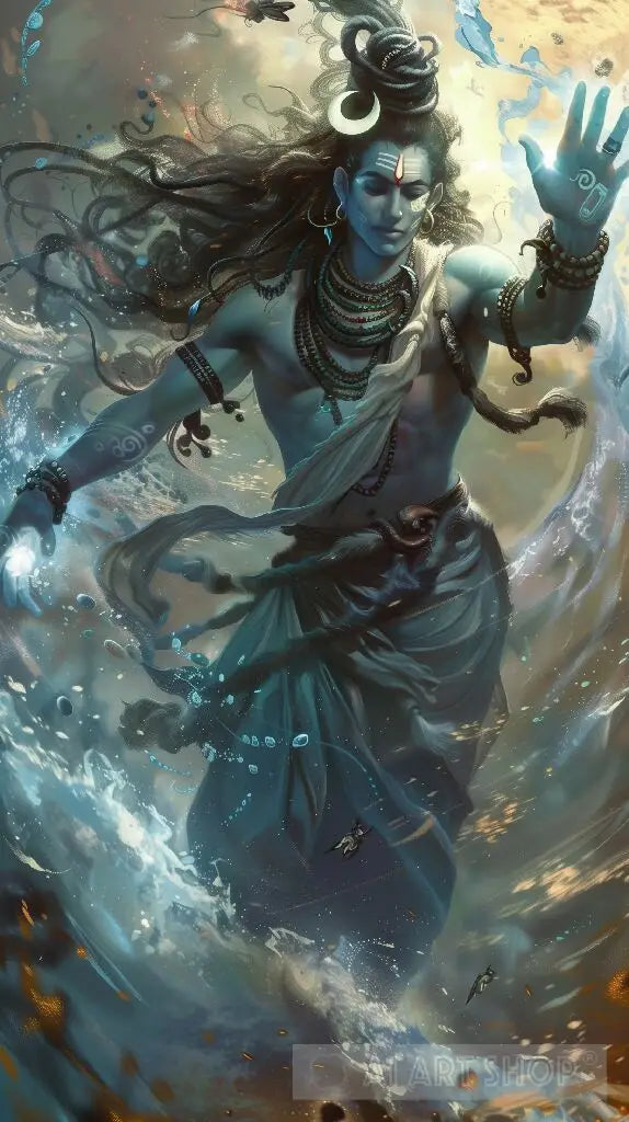 "Dance of Tranquility" is more than just a depiction of a god calming a storm. It's a symbolic representation of Shiva's power to maintain cosmic balance. The artwork's contrasting elements - the fury of the storm and the serenity of Shiva - create a sense of awe and inspiration, leaving the viewer to contemplate the potential for inner peace even amidst life's tempests.