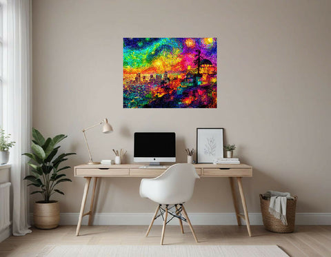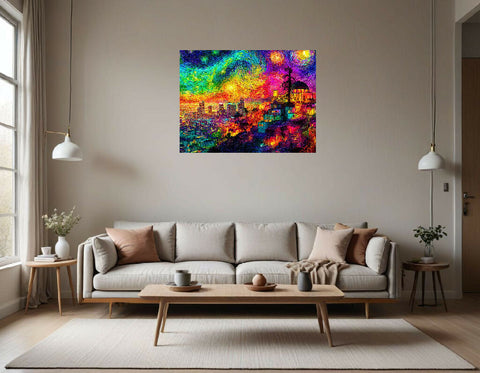 The composition marries iconic Los Angeles landmarks with an imaginative, expressive use of color and movement. The result is a cityscape that is both familiar and fantastically reimagined—a celebration of LA’s nighttime vibrance and creative spirit, set beneath a sky pulsing with cosmic wonder.