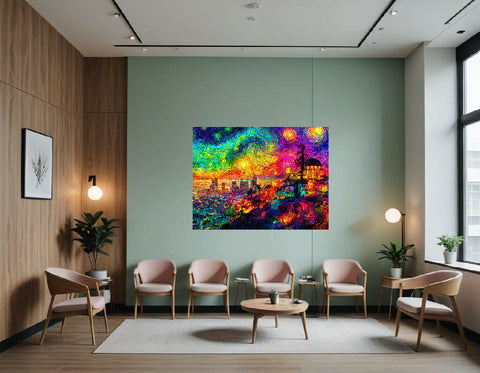 The palette is extraordinarily vivid—electric blues, neon greens, fiery yellows, magentas, and violet hues dominate the canvas. The sky is alive with dramatic, swirling stars and vibrant energy, creating a sense of motion and dreamlike intensity. Each stroke appears bold and textural, giving the image a tactile, almost three-dimensional quality.