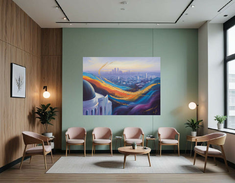 Overall, the painting offers a dreamy and imaginative interpretation of the Los Angeles landscape, blending iconic landmarks with a vibrant and expressive use of color and texture.