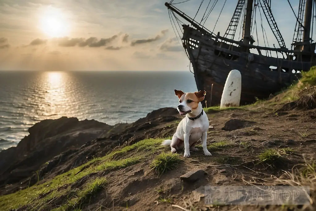 As the small dog surveys the wreckage, one can't help but wonder about the tales of adventure and daring that led to this fateful moment. What secrets lie hidden beneath the waves? What treasures await discovery amidst the wreckage?