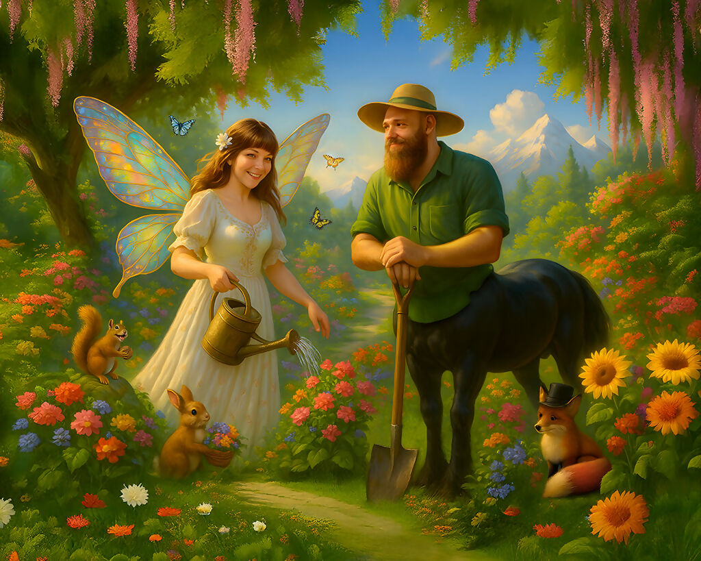 A cheerful springtime fantasy featuring a fairy and a centaur in love, surrounded by a lush magical garden in full bloom.
