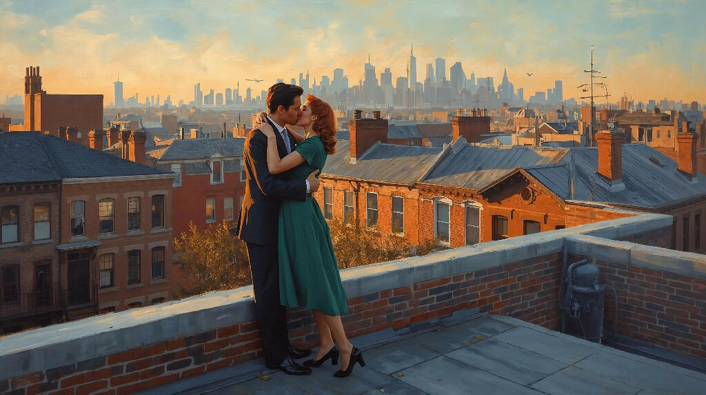 A painting of a couple in love on a Brooklyn rooftop during the 1950's displaying the true essence of the neighborhood.