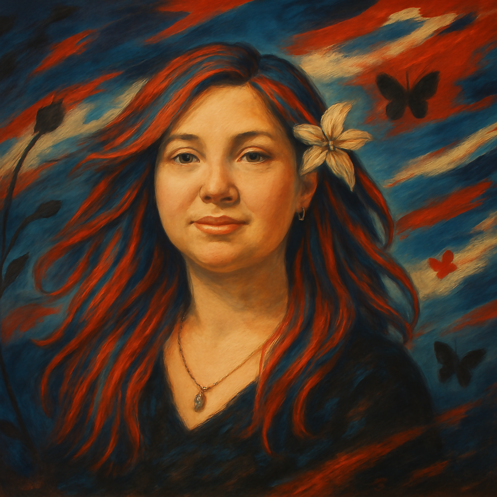 This image is a colorful, Portrait of a woman set against a dynamic, stylized background.