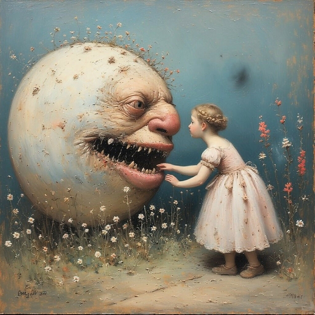 Her gaze is fixed upon a creature of immense proportions, a being both grotesque and strangely compelling. This entity, round and earth-toned, appears to be swathed in soil, yet remarkably, small, vibrant flowers bloom upon its surface, a testament to an unexpected resilience.
