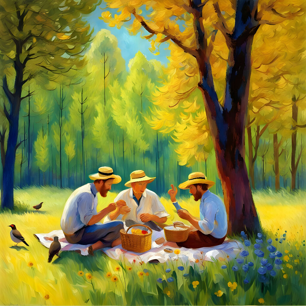 Whimsical, impressionist illustration of a tree just starting to get its spring leaves. In the background are colorful flowers and people having a picnic in the park. [option two of "spring picnic"]