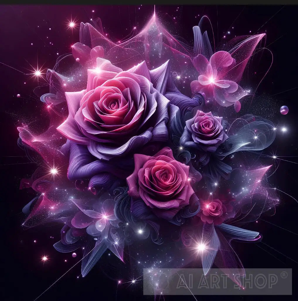 This mesmerizing digital art piece features a stunning bouquet of roses bathed in a celestial glow. The roses, rendered in shades of pink and purple, seem to bloom from a swirling cloud of vibrant hues. Tiny stars twinkle around the flowers, adding a touch of magic and wonder to the scene.This captivating artwork is perfect for those who appreciate digital art, floral motifs, and a touch of the ethereal. It's a great way to add a touch of romance and mystique to any space.