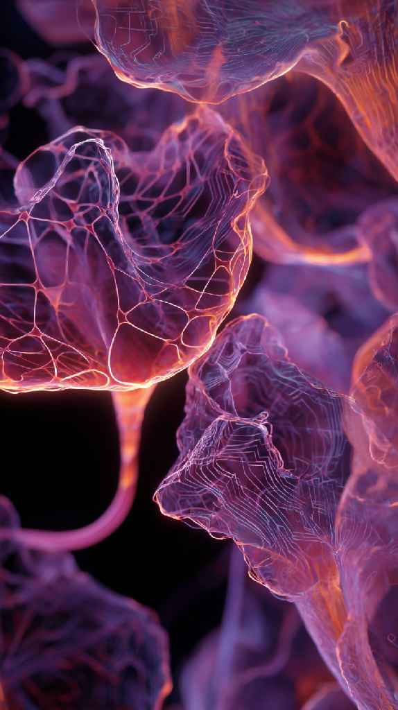 Style: Abstract organic digital with translucent and biomorphic aesthetics. Inspired by neural anatomy, fluid dynamics, and sci-fi visualization. Emphasis on inner glow, layered textures, and surreal depth.