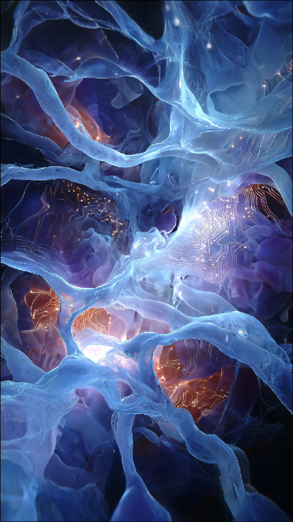 Style: Abstract organic digital with translucent and biomorphic aesthetics. Inspired by neural anatomy, fluid dynamics, and sci-fi visualization. Emphasis on inner glow, layered textures, and surreal depth.