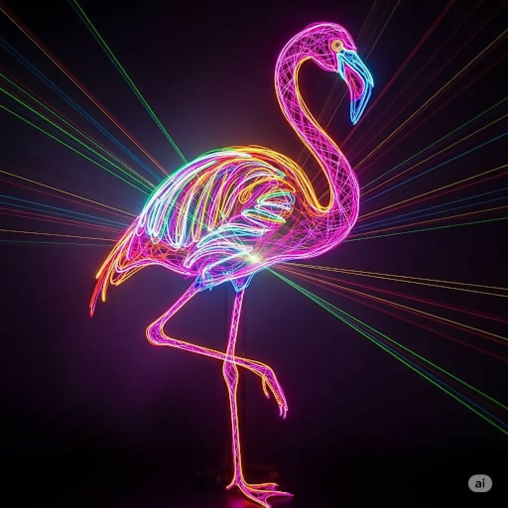 - Illuminate your space with the mesmerizing Lumina Flamingo, a stunning sculpture crafted from vibrant laser light. This piece captures the elegance of a flamingo in a dynamic display of vivid hues, with intertwining beams forming its graceful silhouette. A perfect statement piece to add a touch of modern artistry and radiant color to any room.