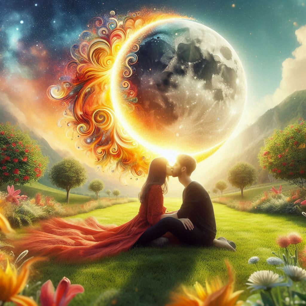 Discover Luminance Whisper, a transcendent artwork where the celestial and the earthly unite in a symphony of light, love, and serenity. This captivating piece immortalizes the Sun and Moon suspended in a harmonious face-off, their radiant glows—blazing gold and ethereal silver—melting into a twilight-kissed sky. Beneath this cosmic duet, a real couple reclines on a velvet-soft lawn, their lips meeting in a tender kiss as wildflowers cradle their embrace, petals shimmering like scattered stardust.