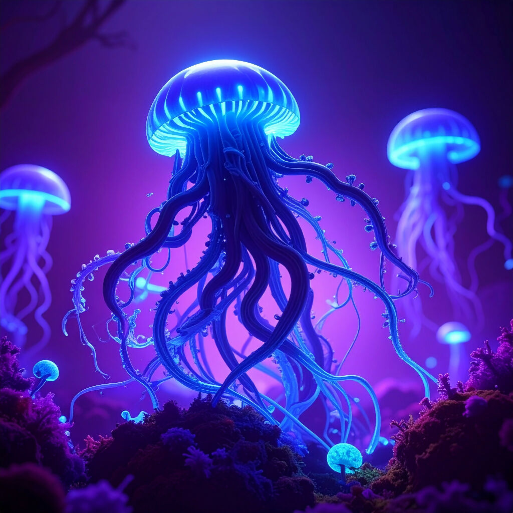 In this mesmerizing image, luminous jellyfish drift gracefully through an otherworldly underwater realm. Their glowing blue bodies and delicate, flowing tentacles emit a radiant light, casting an ethereal glow on the vibrant coral landscape below. The background is awash in shades of purple and pink, enhancing the dreamlike, surreal atmosphere. The scene captures the mysterious beauty of the deep sea, where bioluminescent creatures like Luminara Medusa illuminate the darkness with their enchanting presence.