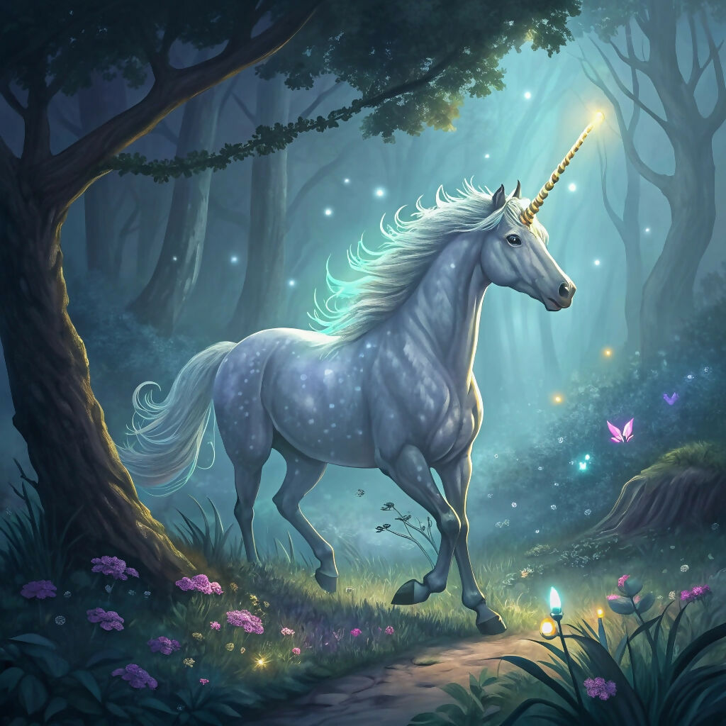 A digital painting shows a light grey unicorn with a long, flowing, white mane and tail. The unicorn is dappled with small, light-blue/white highlights, giving it a luminous, almost sparkling appearance. It has a golden horn that extends upward and trails a faint golden light.