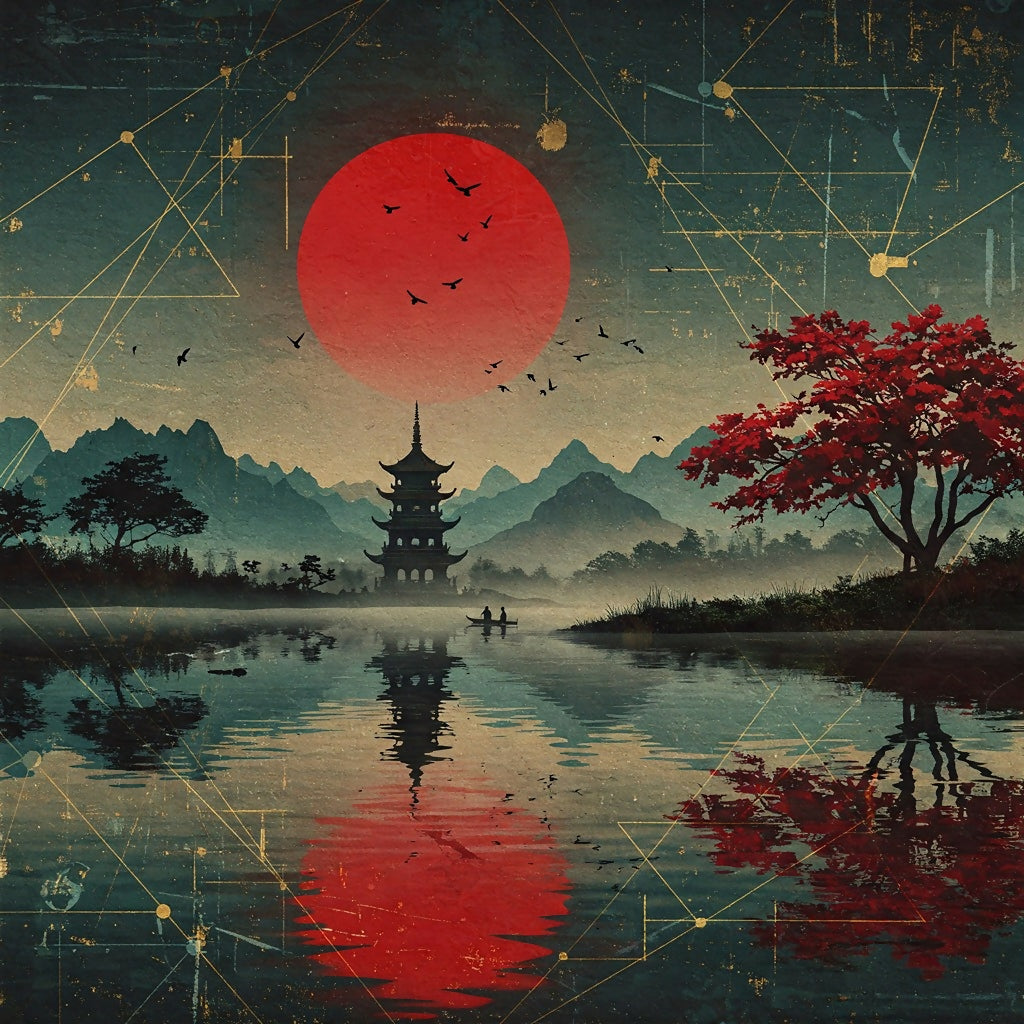 This stylized abstract landscape painting transports you to a surreal, misty forest bathed in the glow of large, luminous orange-yellow suns. Dark silhouette trees stand against the ethereal backdrop, while a network of intersecting lines and splatters of color adds a layer of abstract complexity. The painterly, watercolor-like effect enhances the atmospheric quality of the composition. Using a muted color palette of dark grays and blacks contrasted with warm oranges and yellows, this piece creates a captivating interplay of light and shadow, inviting the viewer into a dreamlike woodland.