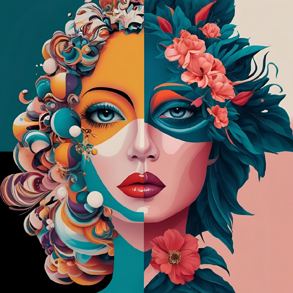 This image features a striking, artistic portrait divided into two contrasting halves. The left side showcases a vibrant explosion of swirling, colorful abstract shapes, reminiscent of marbled paint and dynamic movement. In contrast, the right side presents lush, detailed botanical elements with deep teal leaves and vivid pink flowers, evoking a sense of natural beauty and tranquility. The composition harmoniously blends abstract creativity with organic elegance, creating a visually captivating and imaginative artwork.