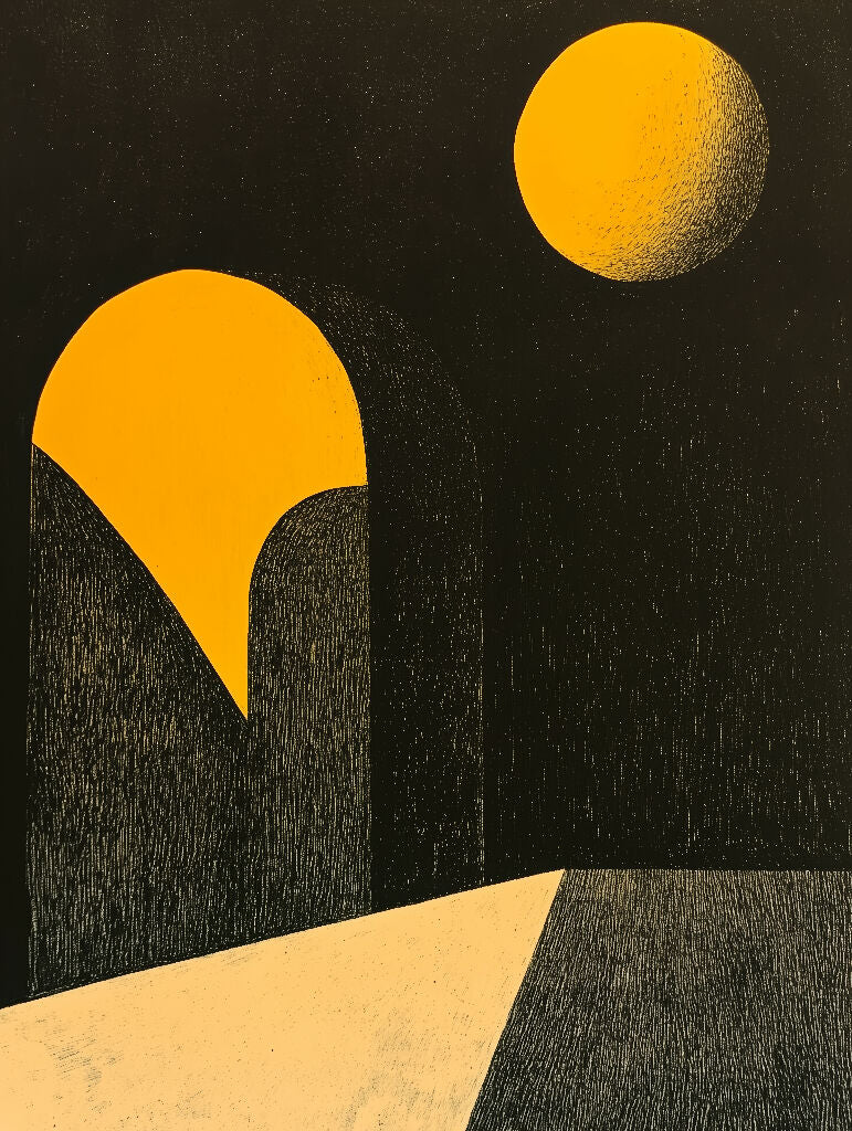 Keywords: minimal abstract, AI artwork, lunar composition, simple shapes, modern wall decor, black and gold tones, balanced art.