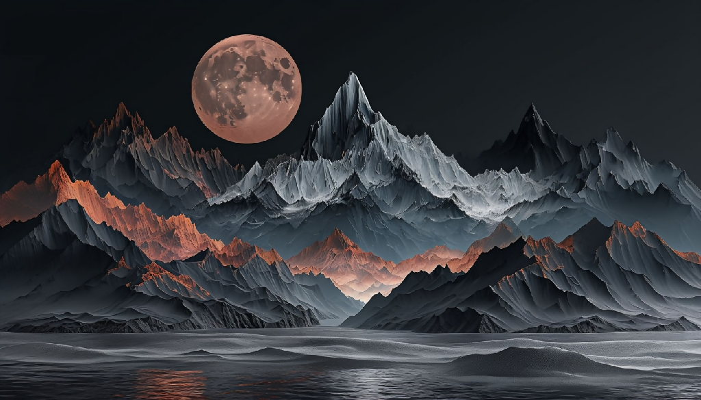 A breathtaking digital artwork depicting a serene yet dramatic landscape under the glow of a large, textured moon. Jagged, obsidian-like mountains rise majestically from a tranquil body of water, their peaks catching the soft, ethereal light of the moon. Hints of warm, fiery hues peek through the shadowed valleys, adding depth and contrast to the otherwise cool, monochromatic palette. The water reflects the moonlight, creating a mirror image of the celestial body and the imposing mountain range, evoking a sense of awe and mystery.