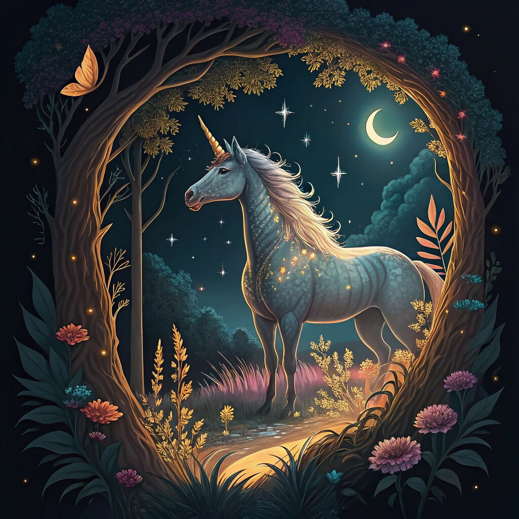 A digital painting depicts a majestic unicorn in a mystical forest at night.