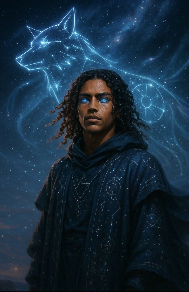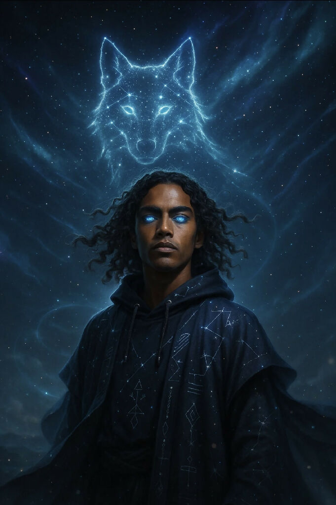 Behind him, in the sky, emerges the majestic shape of a wolf made of constellations. The stars outline its snout, fangs, and glowing eyes. It looks like a cosmic deity watching over him, a celestial guardian. The wolf is not static — it seems to breathe with the stars, shifting ever so slightly, like a living entity etched into the heavens.
