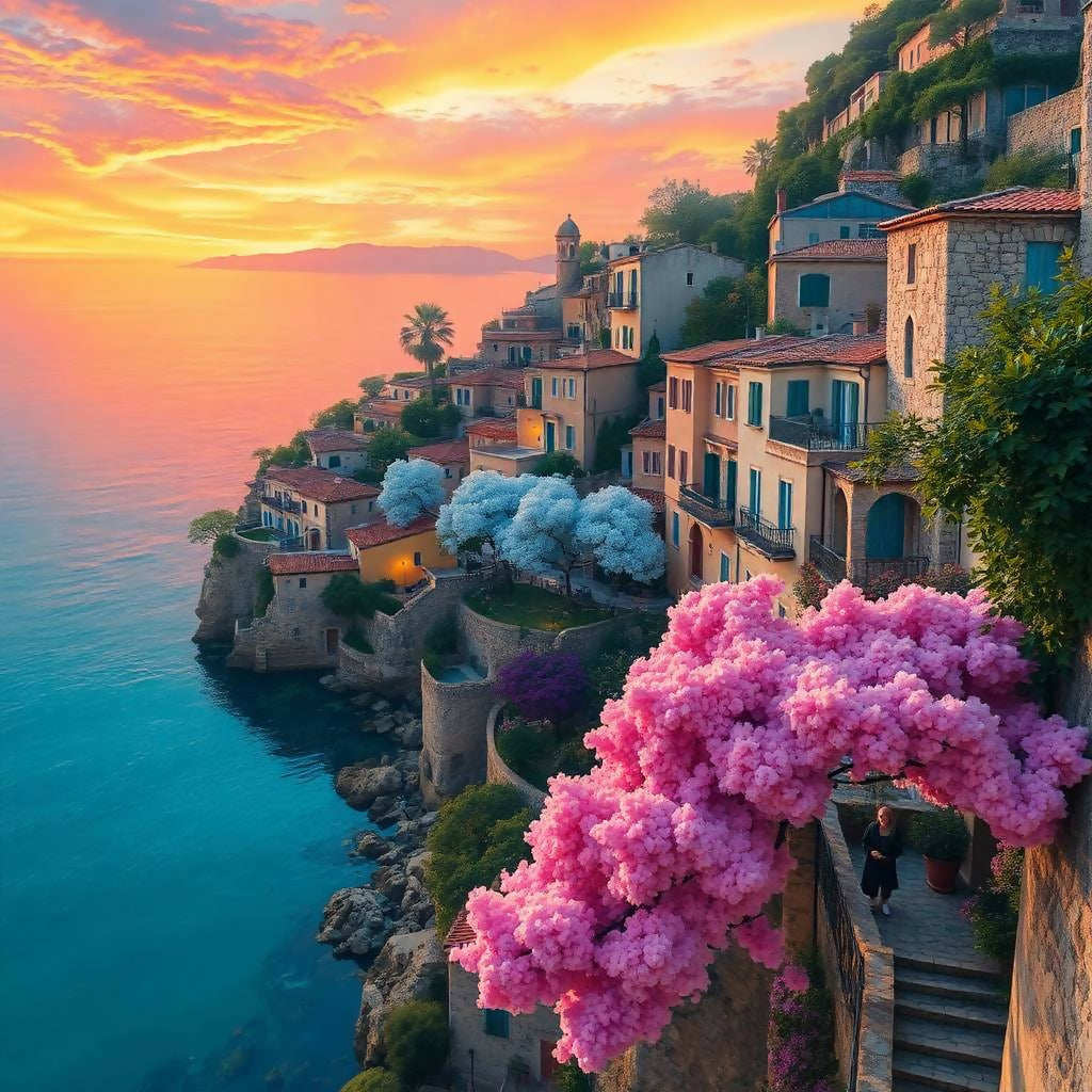 luxurious, surreal fantasy digital painting of a Mediterranean village at dusk, with vibrant cotton-candy colored trees in pastel shades of pink, blue, and yellow, photorealistic lighting that casts a warm golden glow, and ethereal reflections that shimmer on the calm turquoise water, surrounded by intricate stone architecture, lush green foliage, and winding cobblestone streets, with a few villagers in the distance, their faces serene and their skin a warm, sun-kissed brown, as the sky above is set ablaze with hues of orange, purple, and pink, creating a dreamlike atmosphere that is both peaceful and enchanting.
