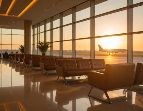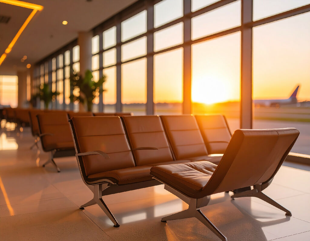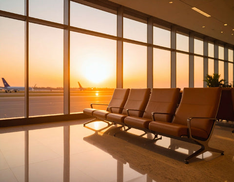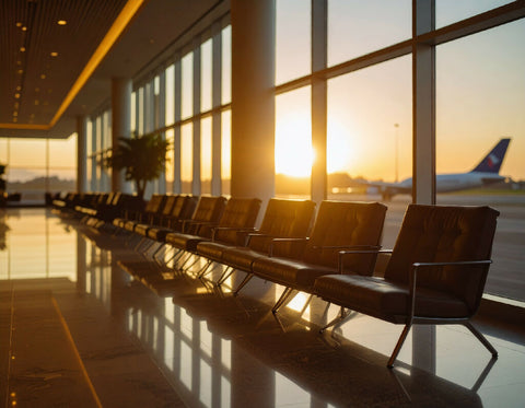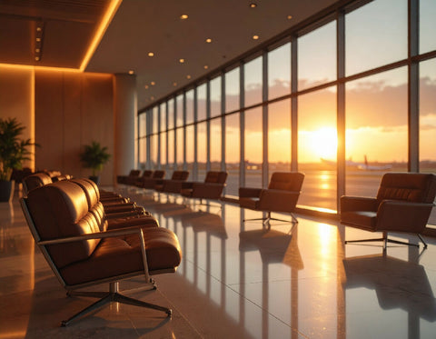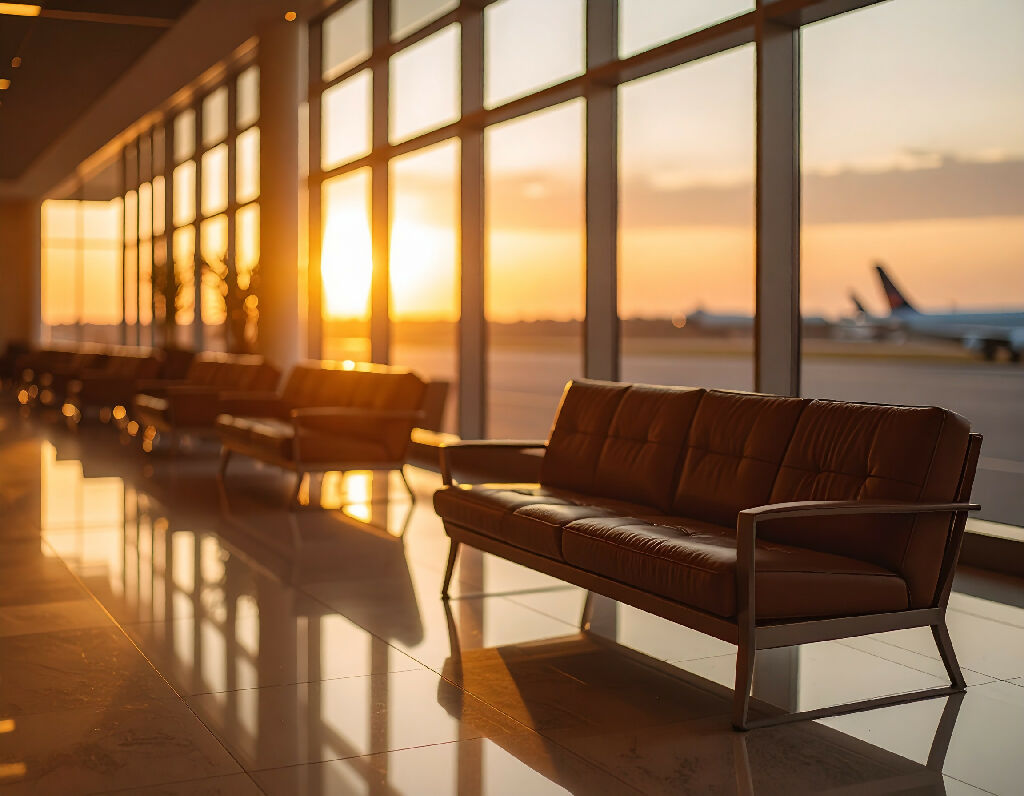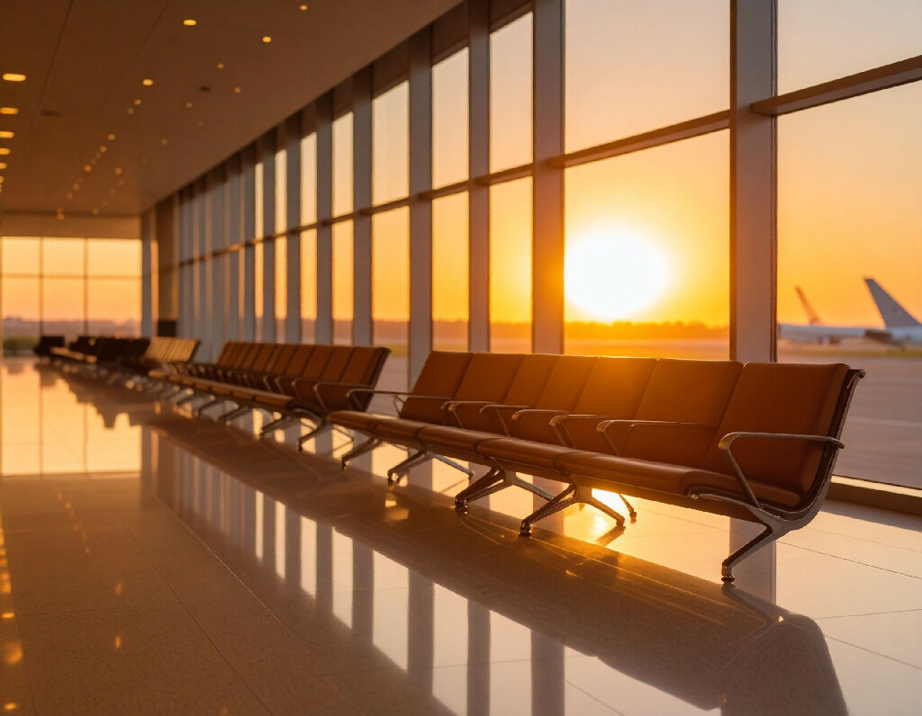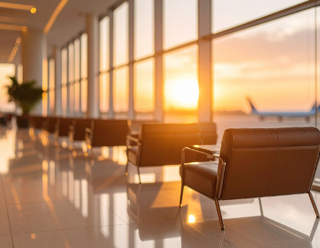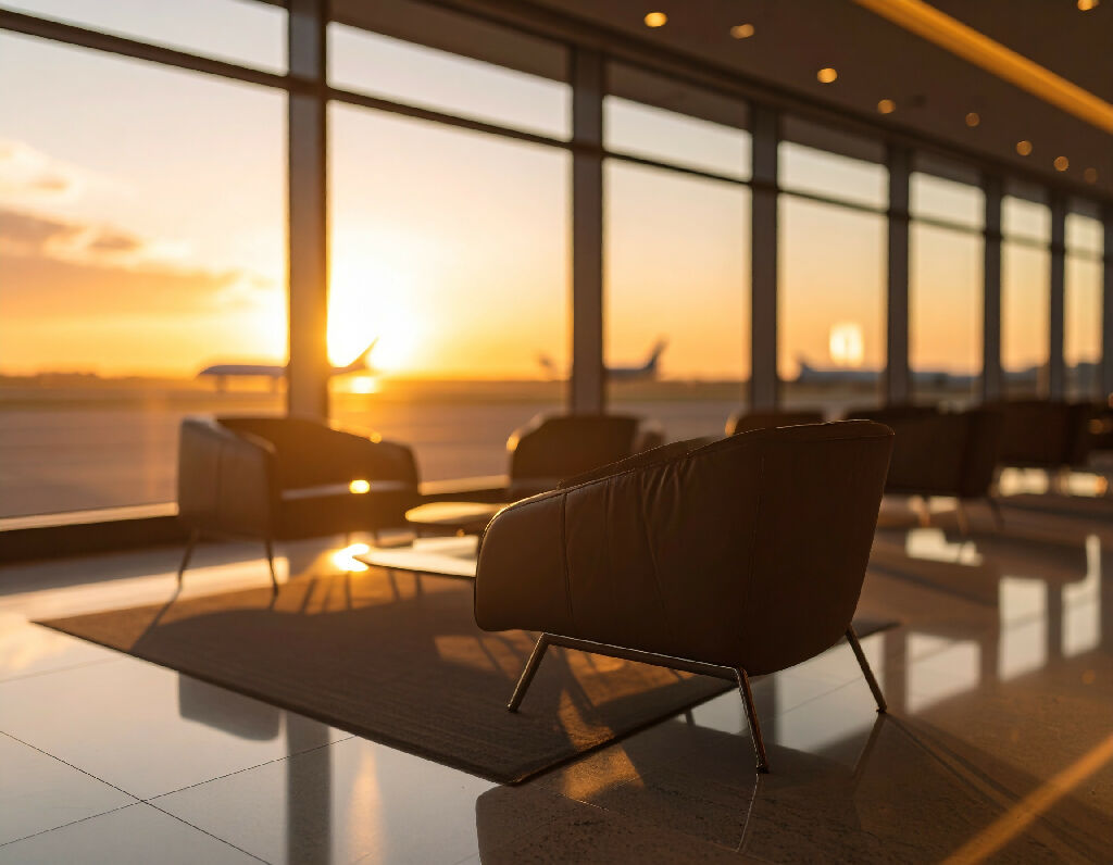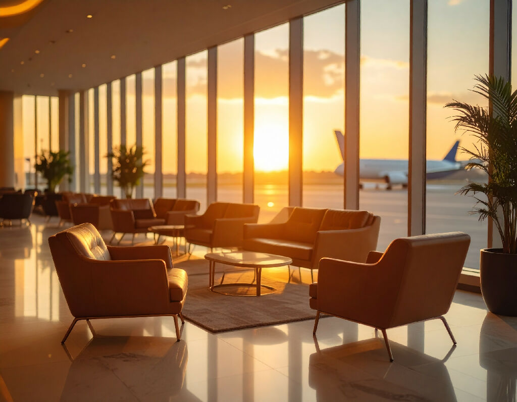 Luxurious airport lounge at sunrise, panoramic floor-to-ceiling glass windows with a clear view of aircraft silhouettes on the runway, modern leather seating clusters, soft golden ambient lighting, polished marble floors, realistic reflections, high-end interior design, photorealistic, landscape orientation
