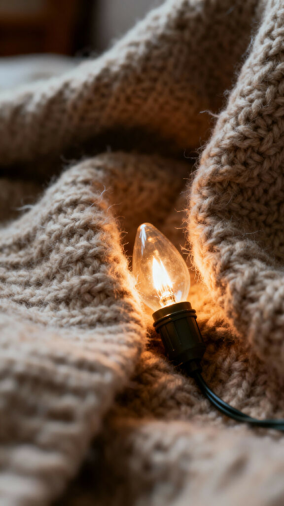 Macro shot of a wool blanket, visible fabric fibers, a softly glowing Christmas light nestled between threads, warm home lighting, quiet cozy atmosphere, photorealistic textile macro, shallow focus