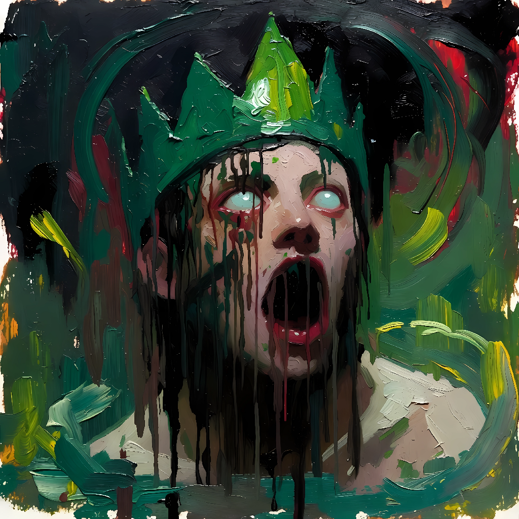 A tormented king wearing a jagged emerald crown screams in agony as thick green and red paint drips down his face like blood and poison. Eyes glowing with unearthly light, surrounded by chaotic dark swirls. Intense horror and psychological torment.