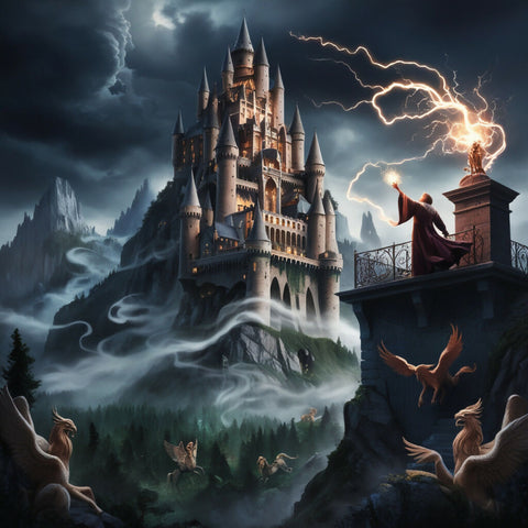 "A towering, ancient castle nestled atop a rugged mountain, with turrets and spires reaching toward a stormy sky. The castle is surrounded by swirling mist and glowing orbs of magical light. A powerful sorcerer in flowing robes stands on a balcony, casting a spell with vibrant, crackling energy emanating from their staff. Below, a dense, enchanted forest stretches out, populated by mythical creatures like griffins and centaurs. The atmosphere is charged with mystery and magic, highlighting the grandeur and mystique of this otherworldly scene."