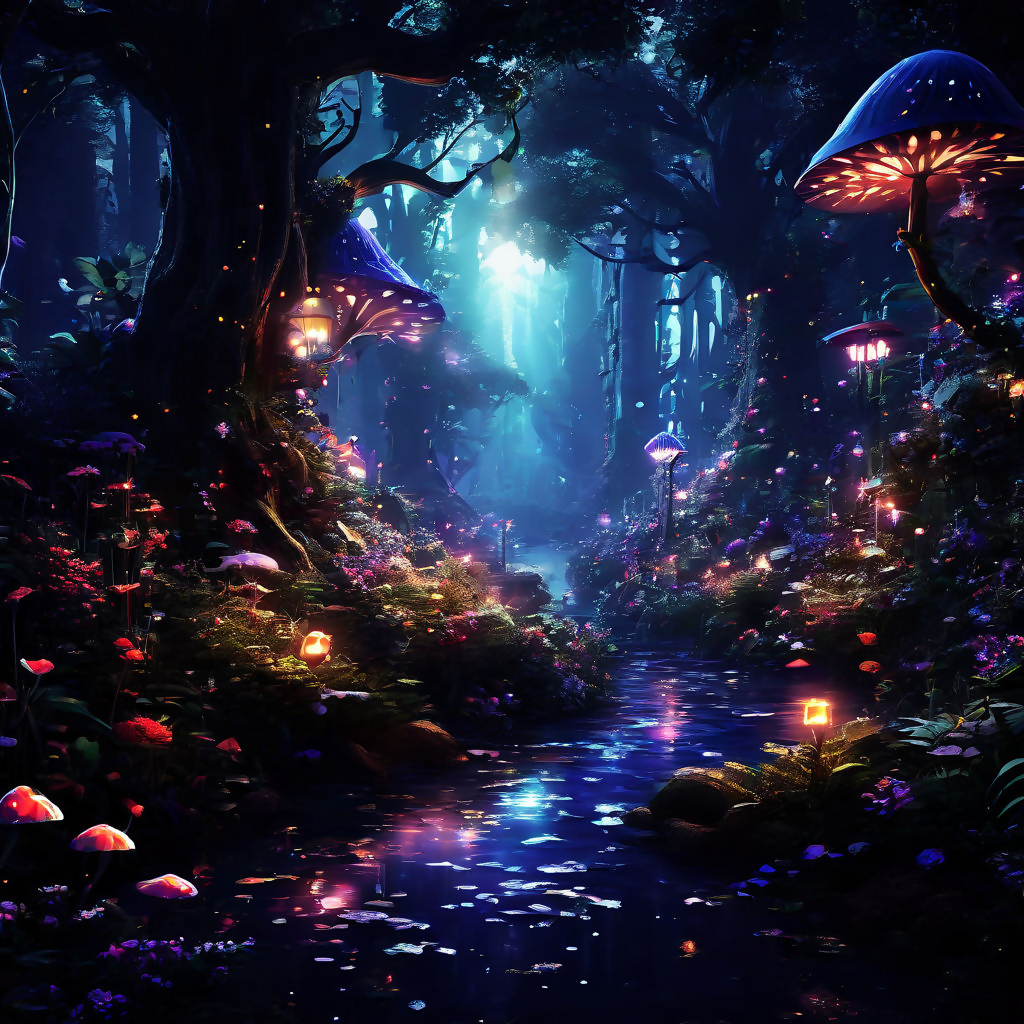 Enchanting digital artwork of a glowing magical forest at twilight, with illuminated mushrooms, sparkling flora, and a mystical atmosphere