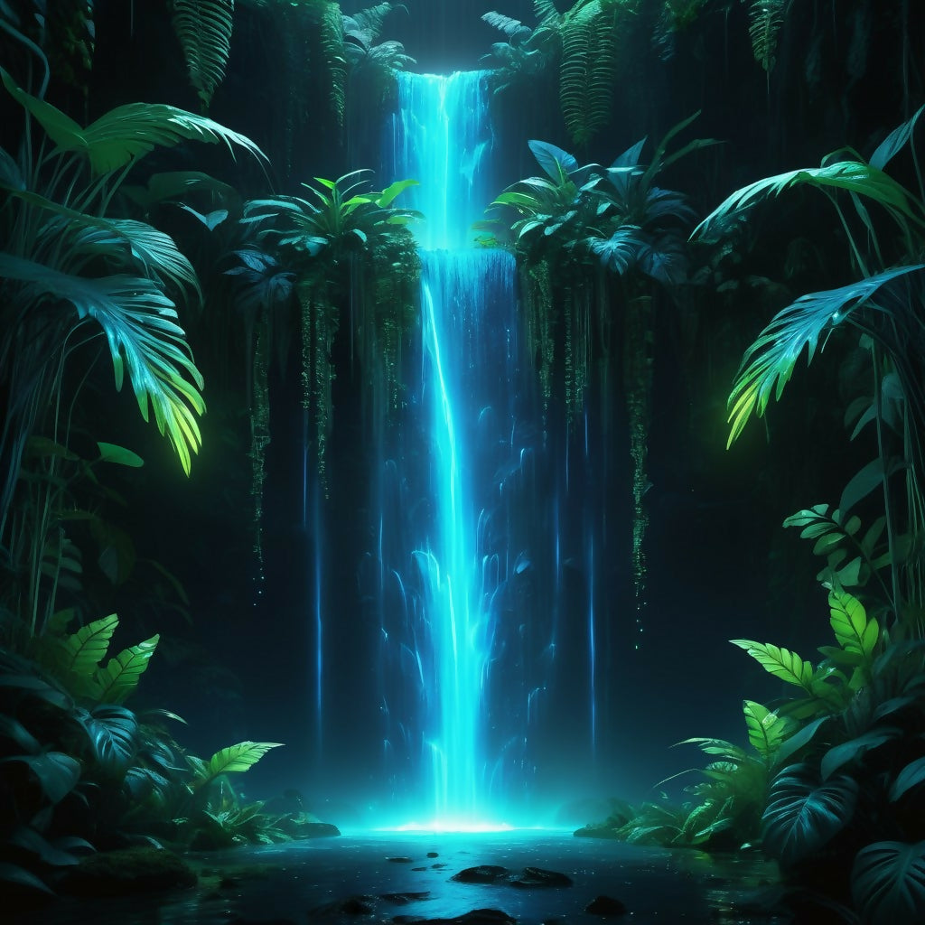 A glowing waterfall with neon blue light, surrounded by lush green plants with magical glow, fantasy cinematic style