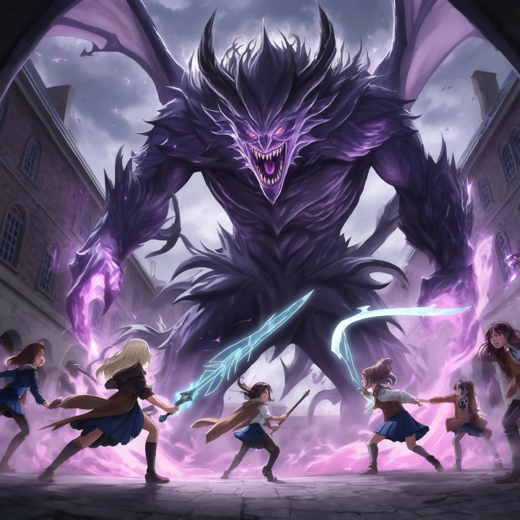 An intense fantasy battle scene featuring a colossal, demonic-looking monster in deep purple, with wings and sharp claws, towering over a gothic town square. In the foreground, a group of girls, dressed in Japanese-style school uniforms (Seifuku), are engaging it, wielding glowing cyan and magenta energy weapons and magic. The motion and drama are palpable, with purple magic energy radiating from the ground.