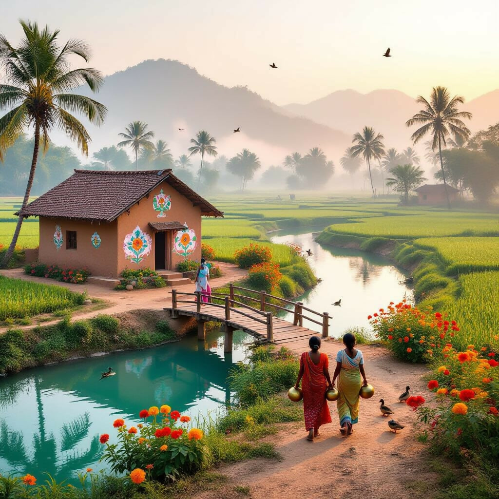 This artwork captures the pure magic of an Indian village at sunrise. A charming mud house decorated with floral patterns sits beside a turquoise river connected by a small wooden bridge. Morning dew sparkles on lush rice fields, while distant pastel-colored hills melt into golden mist. Children feed ducks, women walk with brass pots, and smoke from a chulha rises into the calm air, adding authenticity and warmth. Painted in a stunning watercolor + oil mural style, this wallpaper delivers a cinematic, soothing, and ultra-premium rural scene perfect for décor and digital screens.
