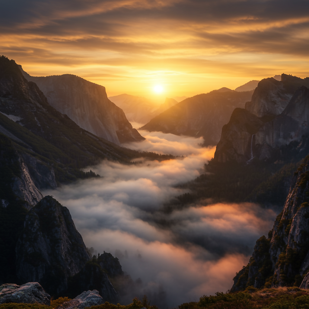 A breathtaking fantasy landscape of a golden sunset over towering mountains, where a valley is filled with glowing clouds and mist. The warm orange and golden tones create a cinematic and magical atmosphere, blending serenity with the raw beauty of nature.