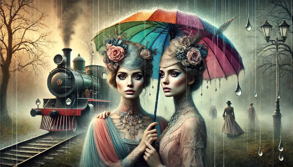 A captivating artistic portrait of two women, inspired by the style of Salvador Dali, standing in a mystical, dreamlike park setting with an old steam
