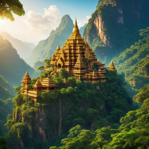 Majestic, ancient temples surrounded by lush greenery or perched on mountain tops, with intricate carvings and golden spires. The scene is peaceful, illuminated by soft sunlight or moonlight.