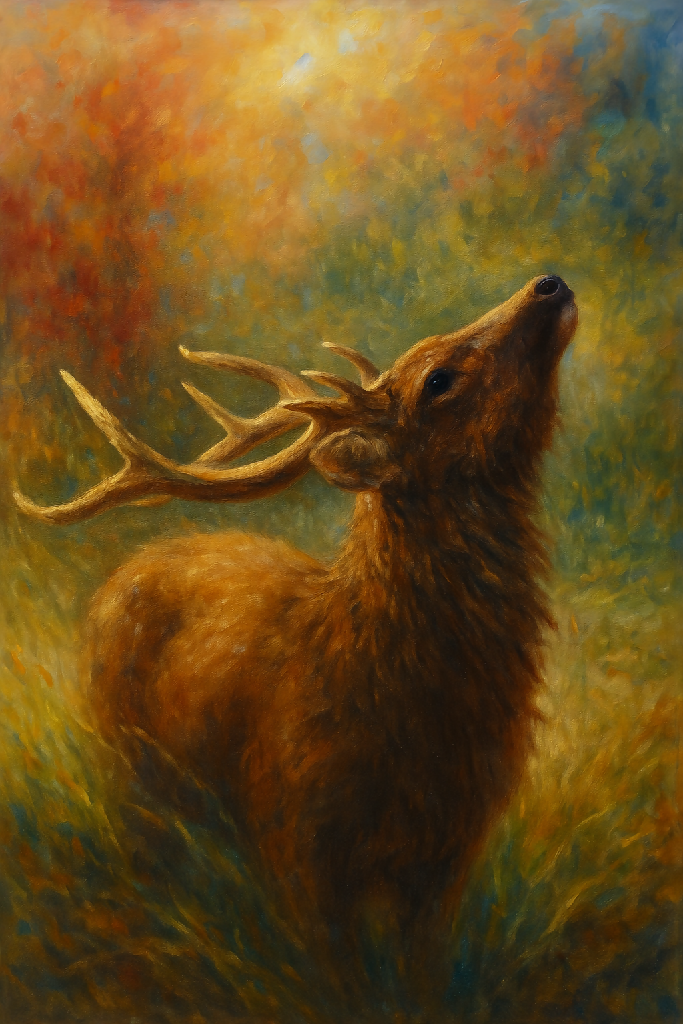 The image shows a majestic deer, possibly a stag, with large, branched antlers