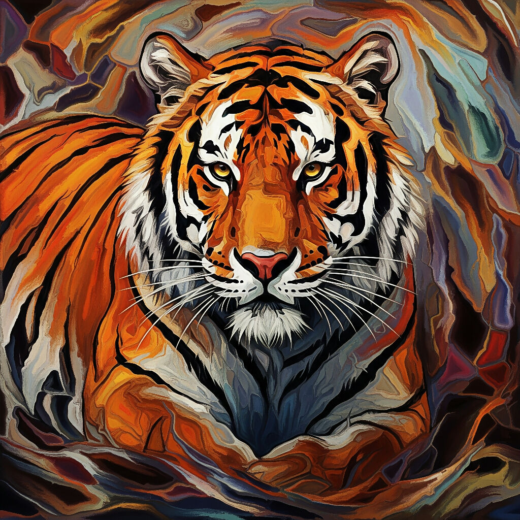 This image features a strikingly vibrant and stylized portrait of a tiger. The animal’s intense golden eyes and bold black stripes are accentuated by rich, swirling patterns of orange, white, and dark hues that blend seamlessly into the background. The artistic rendering gives the tiger a powerful and regal presence, capturing both its beauty and strength in a captivating, almost surreal manner.